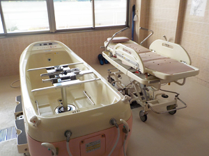 利用者様の身体機能に合わせて、座ったまま、寝たままの姿勢で入浴出来る浴槽を設置しています。