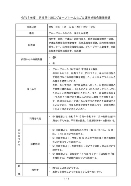 萩市中津江認知症高齢者グループホームなごみです。 1月22日に開催いたしました「運営推進会議」の議事録を掲載します。